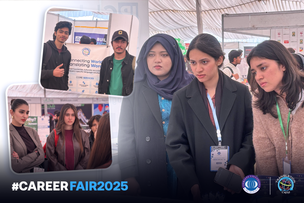 The Fall 2025 Job Fair season started off strong as Translation Empire took part in two notable university events in Islamabad: the Riphah University Job Fair 2025 and the COMSATS Industrial Connect Fall ’25. Both fairs were great chances to meet new talent, get alumni more involved, and show students the various new career paths that are opening up in the translation, localisation, and digital industries.